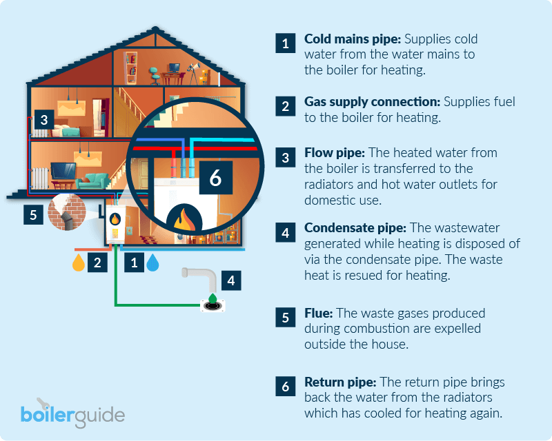 - Flow pipe: The heated water from the boiler is transferred to the radiators and hot water outlets for domestic use.